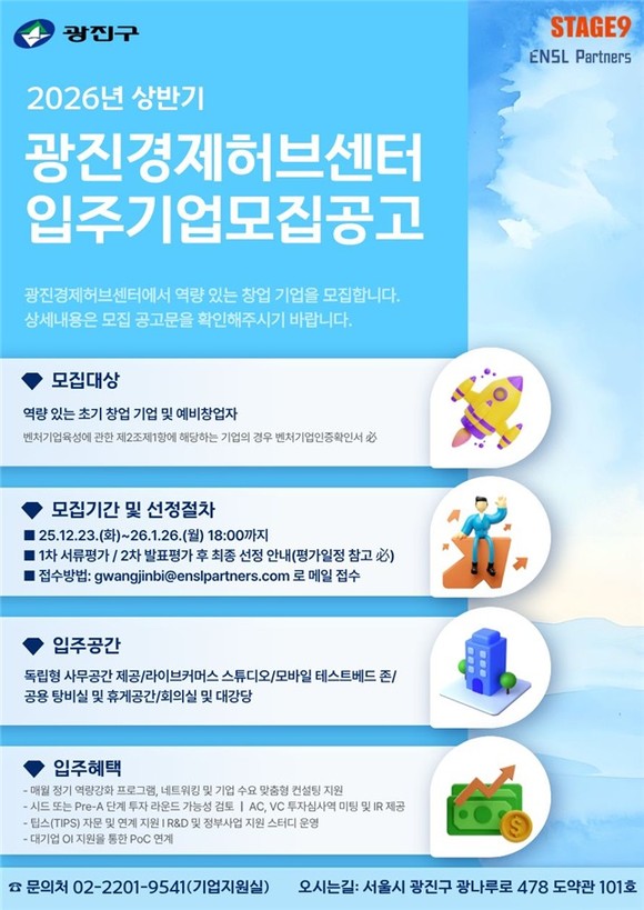 신청 기간은 2026년 1월 26일까지다. 광진구청 또는 엔슬파트너스 누리집에 게시된 서식에 따라 제출 서류를 준비해 이메일로 접수하면 된다. 구는 기술성, 시장성, 사업성 등에 대한 평가와 심사를 거쳐 입주기업을 최종 선정하고 개별 안내할 예정이다. 자세한 사항은 광진경제허브센터 기업지원실로 문의하면 된다.