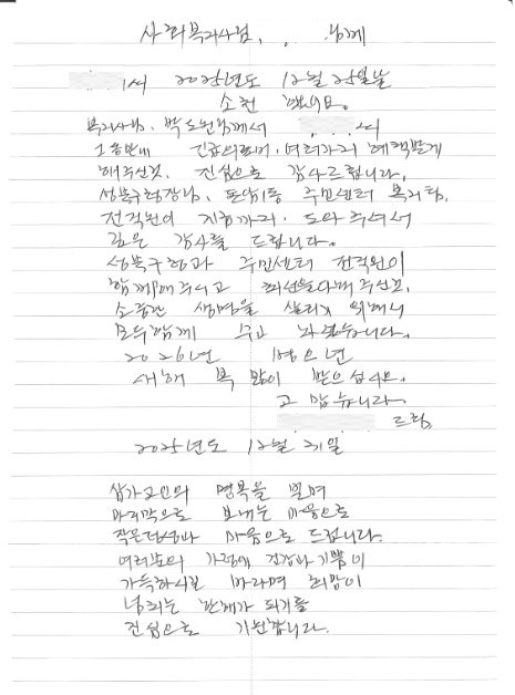 서울 성북구(구청장 이승로) 돈암1동주민센터에 최근 한 통의 손편지가 전달됐다. 배우자를 돌보며 경제적·행정적 부담을 겪던 주민 A씨가 의료·복지 지원을 연계 받은 데 대한 감사의 뜻을 전한 것이다.