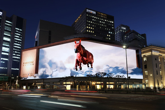이번 미디어아트는 ‘천마도’에서 영감을 얻어 구름 사이로 말이 등장해 힘차게 달리는 모습을 담았으며, 입체감과 현장감을 표현하는 아나몰픽 기법을 활용했다.