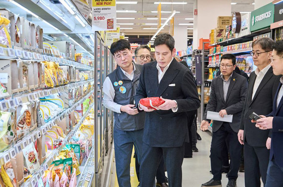 지하 1층 그로서리 특화 매장에서는 초입부에 배치된 와인 코너, 직장인들의 간편한 한끼 메뉴를 모은 ‘그랩앤고’를 지나 수산물과 축산물, 냉동식품, 피코크·5K프라이스 등 PL 매장, 과자와 라면 등 가공식품까지 곳곳을 찾았다. 고객이 일반적으로 이동하는 순서에 따라 매장을 돌며 동선은 적절하게 짜여 있는지 상품 가격은 적절한지 등을 꼼꼼히 살폈다.