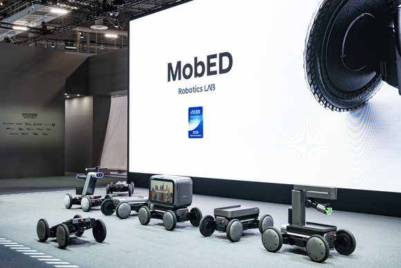 AI 로보틱스가 구현할 스마트한 일상도 강조됐다. 차세대 소형 모빌리티 로봇 플랫폼 모베드는 상용화 모델과 함께 배송, 물류, 이동 등 다양한 활용이 가능한 탑모듈 결합 콘셉트 모델로 소개됐다. 모베드는 독립 구동 휠과 편심 자세 제어 기술을 바탕으로 경사와 요철에서도 안정적인 주행이 가능하며, 연구 개발용 베이직 모델과 자율주행 기능을 갖춘 프로 모델로 구성됐다.