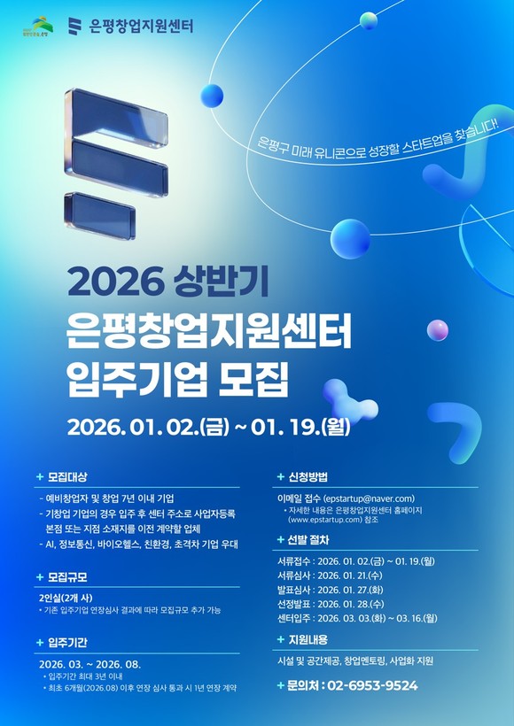 서울 은평구(구청장 김미경)는 ‘2026년도 상반기 은평창업지원센터 입주기업’을 오는 19일까지 모집한다고 밝혔다.