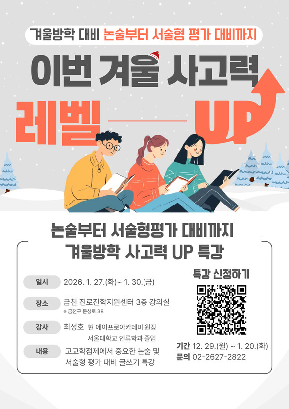 서울 금천구(구청장 유성훈)는 겨울방학을 맞아 관내 중학생과 예비고등학교 1학년을 대상으로 논술·서술형 특강을 운영한다고 밝혔다.