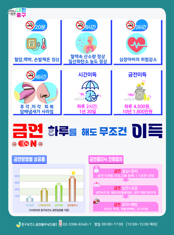 이런 밀착지원 덕분에 중구의 금연 성공률은 2024년 36.1%에서 지난해 38.4%로 2.3%p 상승하며 자치구 금연클리닉 평균인 31.1%(24년 기준)를 훌쩍 넘었다. 아울러, 개인의 의지만으로 금연에 성공한 경우와 비교하면, 금연클리닉 이용 시 성공률은 약 9배 이상 높은 것으로 나타났다.