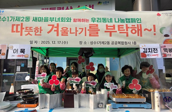 먼저 성수1가제2동 새마을부녀회(회장 박인자)는 지난 12월 17일 공공복합청사 앞에서 호떡, 김치전, 어묵 등 인기 겨울 간식을 직접 만들어 판매해 수익금 949천 원 전액을 따뜻한 겨울나기 성금으로 기부했다. 나눔네트워크 동 특화사업으로 개최된 이번 행사는 주민들에게 성금 모금을 널리 알리고 참여를 독려하기 위해 열렸다.