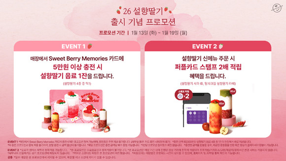 한편 커피빈은 설향딸기 신메뉴 출시를 기념해 13~19일 프로모션을 진행한다. ‘스위트 베리 메모리즈(Sweet Berry Memories)’ 카드에 5만 원 이상 충전 시 설향딸기 음료 1잔을 무료로 증정하며, 말차크림 설향 딸기 라떼와 설향 딸기 사과IB 주문 시 퍼플 스탬프를 더블 적립해준다.