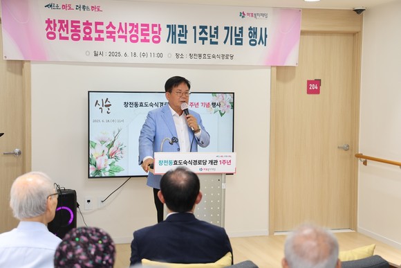 박강수 마포구청장이 창전동 효도숙식 경로당 개관 1주년을 맞아 축하 인사말을 전하고 있다. 사진=마포구청