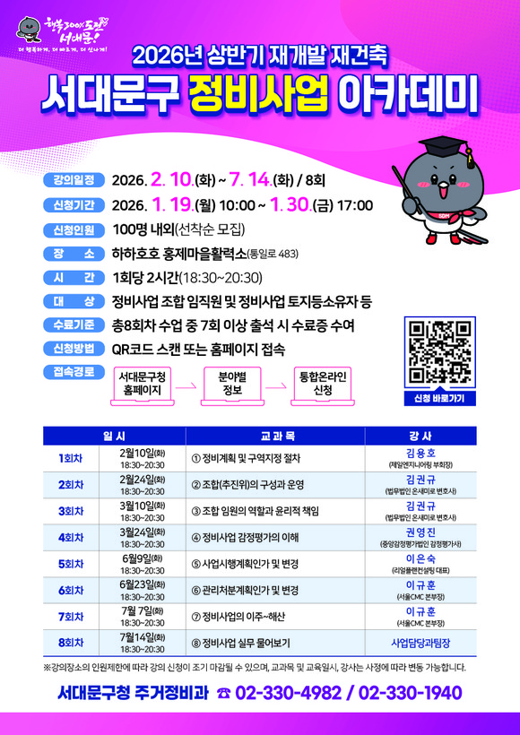 이성헌 서대문구청장은 “정비사업에 대한 이해와 실무 능력 증진이 원활하고 속도감 있는 사업 추진으로 이어지길 기대한다”고 말했다.