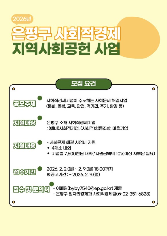 모집 대상은 은평구에 소재한 (예비)사회적기업, (사회적)협동조합, 마을기업 등이다. 면접 심사를 통해 사업계획의 적정성, 혁신성, 사회적 가치 기여도 등을 종합적으로 평가해 실질적인 지역 변화로 이어질 수 있는 지역사회공헌사업을 선정할 예정이다.