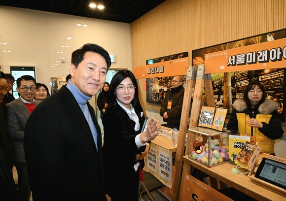 오세훈 서울시장이 24일(토) 강동중앙도서관에서 열린 ‘서울패밀리데이’ 행사에 마련된 부스를 둘러보고 있다. 사진=서울시청
