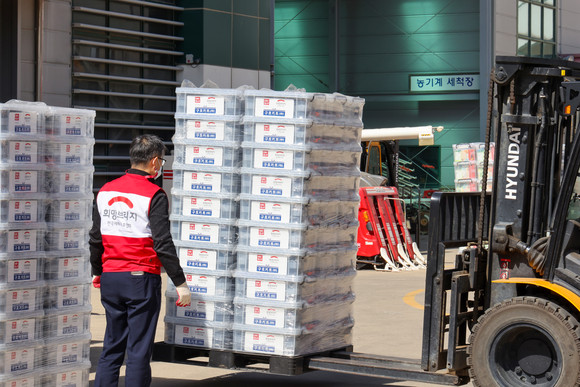 희망브리지가 2020년 울진 산불 당시 유니클로의 후원으로 제작된 이재민 긴급구호키트를 운송하고 있다. 사진=희망브리지