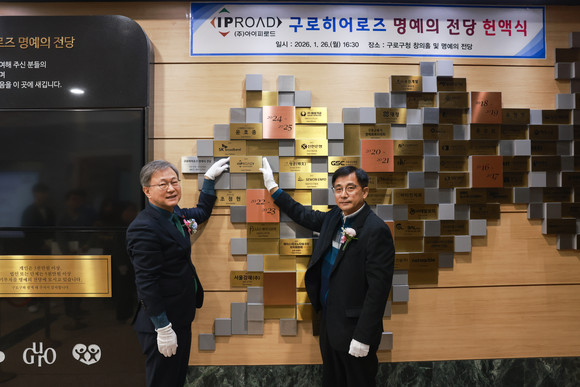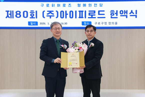 이날 장 구청장은 구청 창의홀에서 ㈜아이피로드(대표 강철지)에게 사회공헌 인증서를 전달하고, 본관 1층 명예의 전당에 제80호 구로히어로즈 명패를 등재했다.