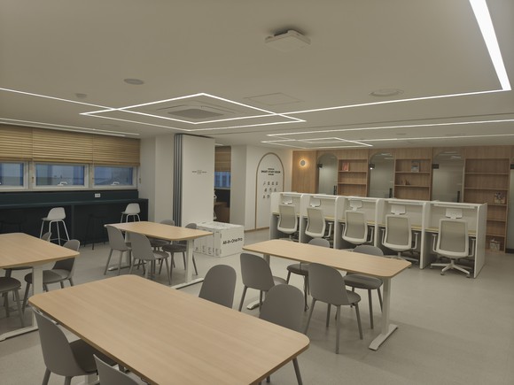지난 21일 문을 연 스마트 스터디룸은 총면적 108㎡(32평) 규모로, 1인실 스터디룸 4개와 오픈형 좌석 10개, 다인용 테이블 16석 등 다양한 학습 및 청소년 활동 형태를 고려한 좌석 구성을 갖췄다. 쾌적한 분위기에 일체형 PC와 아이패드 등 디지털 학습기기도 구비했다.