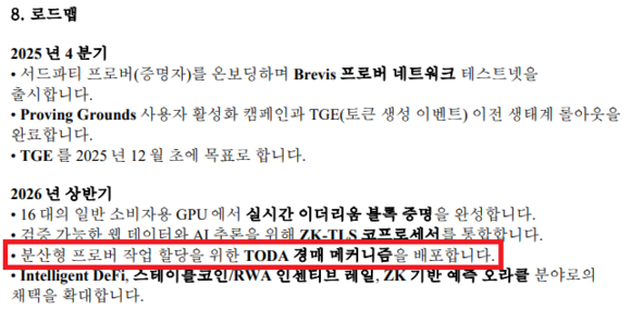 이에 대해 빗썸은 “BREV 백서에 기재된 바와 같이 Brevis Prover Network 테스트넷은 2025년 4분기 가동을 목표로 개발이 진행됐으며, TODA 기반 경매형 증명 시장은 2026년 상반기 가동을 목표로 단계적으로 구현되고 있다”고 설명했다.