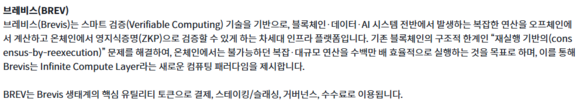 빗썸은 브레비스에 대해 스마트 검증(Verifiable Computing) 기술을 기반으로, 블록체인·데이터·AI 시스템 전반에서 발생하는 복잡한 연산을 오프체인에서 처리하고, 그 결과를 온체인에서 영지식증명(ZKP) 방식으로 검증할 수 있도록 설계된 차세대 인프라 플랫폼이라 소개하고 있다.