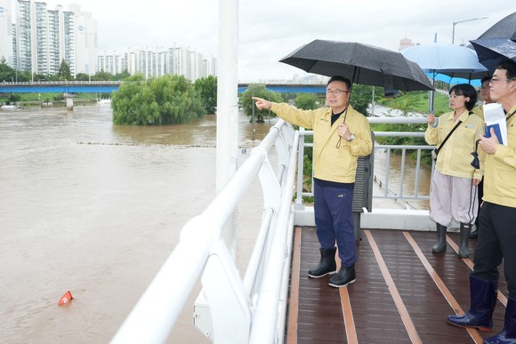 지난해 8월 중랑천 홍수주의보 발표에 따라 긴급 현장 점검을 하는 류경기 중랑구청장. 사진=중랑구청