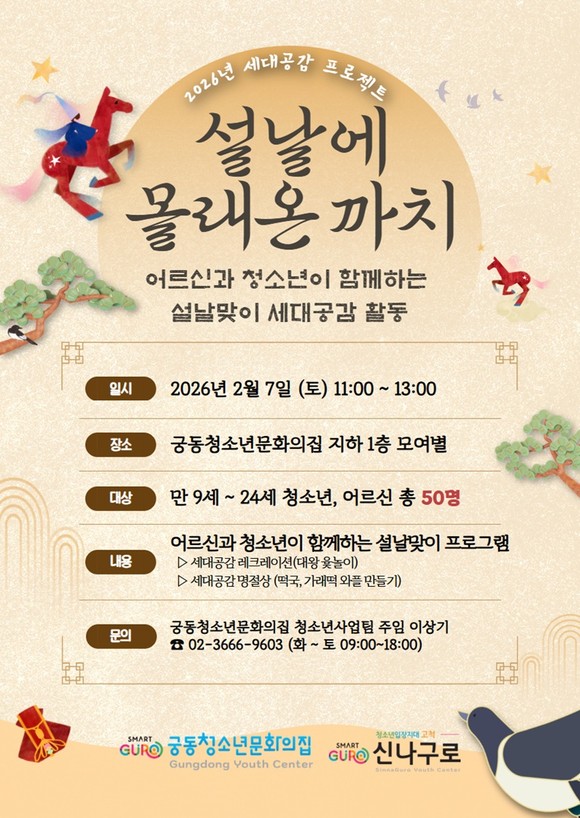 같은 날 오전 11시, 궁동청소년문화의집 지하 1층 ‘모여별’에서는 세대공감 프로그램 ‘설날에 몰래 온 까치’가 열린다. 관내 9세부터 24세 청소년과 수궁동 일대 어르신 50여 명이 참여해 옛 문화와 현대 문화를 함께 배우고 윷놀이와 떡국 만들기 체험을 통해 명절의 따뜻한 정을 나눈다.