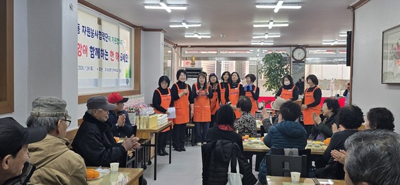 설을 앞두고 구로5동 자원봉사협력단이 지역 어르신들을 초청해 따뜻한 식사를 대접하고 있다. 자원봉사자들은 명절 인사를 전하며 감사의 마음을 나누고 있다. 사진=구로구청