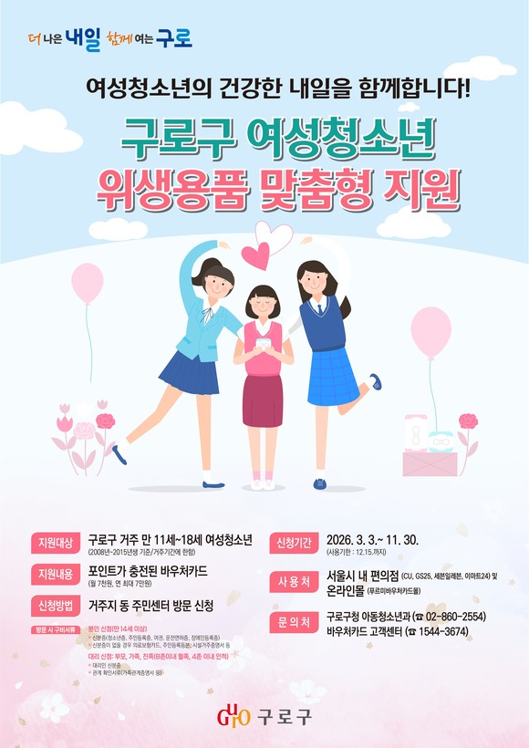 서울 구로구(구청장 장인홍)가 3월부터 관내 여성청소년을 대상으로 생리용품(위생용품) 바우처 지원 사업을 시행한다. 구는 기존 학교·청소년시설 비치 방식에서 바우처카드 방식으로 전환해 청소년의 이용 편의와 제품 선택권을 강화했다.