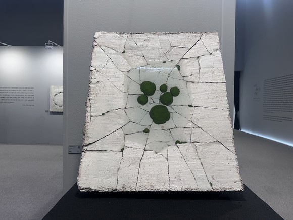 이끼라는 소재는 계속 가지고 가지만, 이를 담아내는 표현 방식에는 늘 아쉬움이 적잖았다. 해서, 선택한 게 시멘트 레진이다. 시멘트 평판의 균열 틈새에 이끼를 그려 넣고, 그 위에 레진을 붓고, 또 그리고 또 붓고, 이를 최소 아홉 번에서 열 번을 작업한다. 작가는 이를 통해 무얼 말하려 했을까.