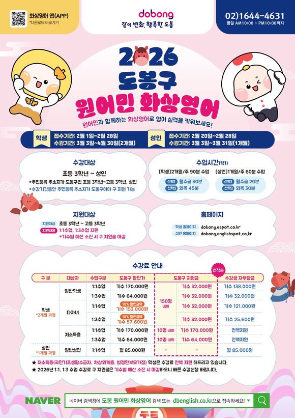 서울 도봉구(구청장 오언석)가 지역 내 초‧중‧고 학생에게 원어민 화상영어학습 수강료를 지원한다.