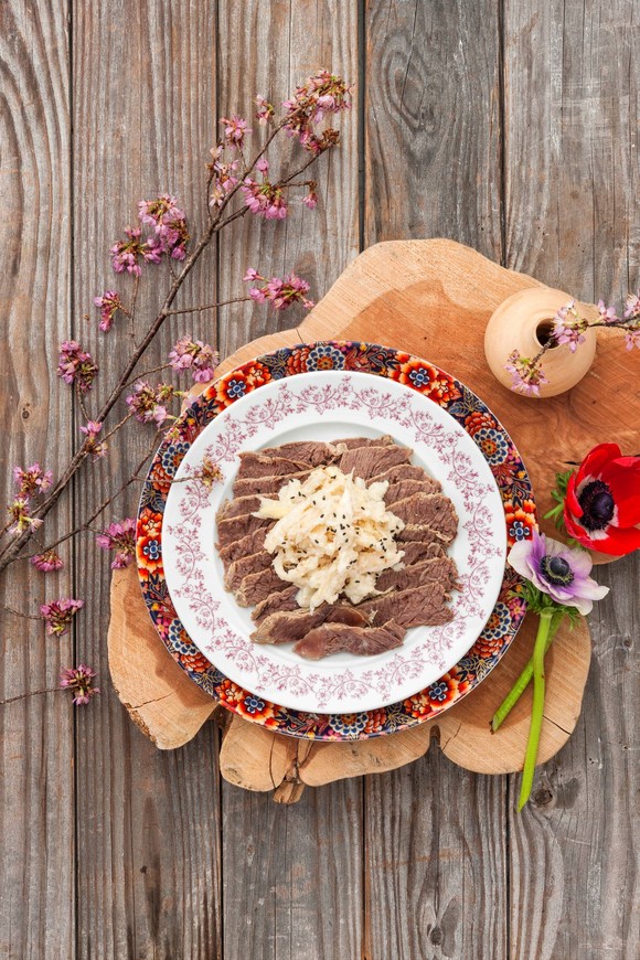 기름진 명절 음식이 부담스럽거나 깔끔하면서도 품격 있는 상차림을 고민하고 있다면, 담백한 한우 사태에 향긋한 더덕을 곁들인 ‘한우 사태 더덕냉채’가 제격이다. 한우 사태는 담백하면서도 깊은 육향이 살아 있는 부위로, 충분히 익히면 결이 자연스럽게 풀어지며 부드럽고 폭신한 식감을 즐길 수 있다. 짙은 육향이 매력적인 부위라 쌉싸름한 더덕과 고소한 잣소스를 곁들이면 더욱 고급스러운 풍미를 자아낸다. 특히 자극적이지 않고 정갈한 맛 덕분에 명절 상차림의 격을 한층 높여주는 메뉴다.