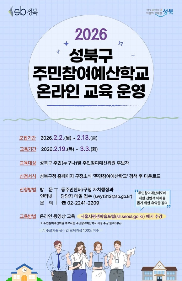 서울 성북구(구청장 이승로)가 오는 13일까지 주민 참여를 통한 지역 현안 해결과 재정 민주주의 실현을 위해 2026년 주민참여예산위원회 위원을 공개 모집한다.