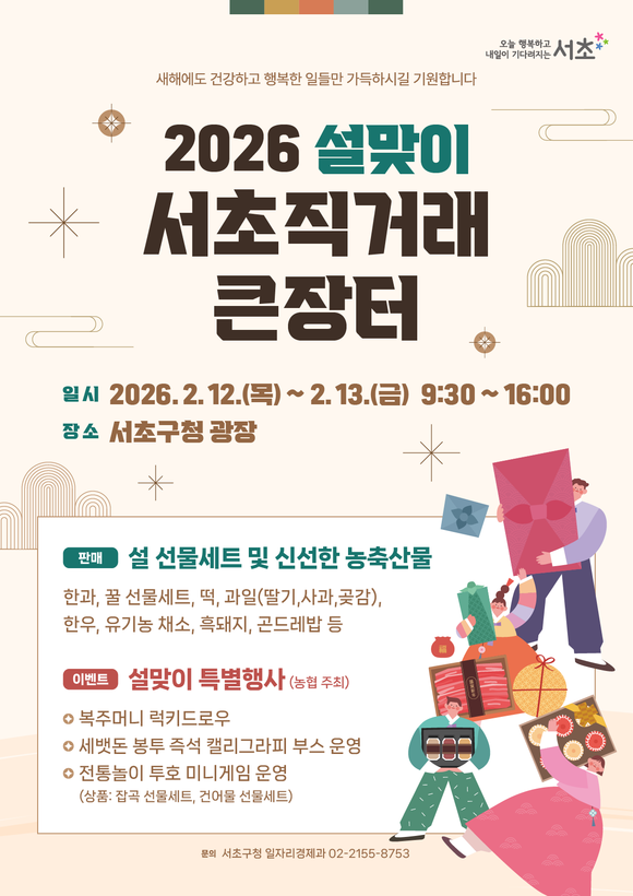 서울 서초구(구청장 전성수)는 설 명절을 맞아 오는 12일, 13일 이틀간 구청 광장과 인근 음악산책길에서 ‘설맞이 서초 직거래 큰장터’를 개최한다.