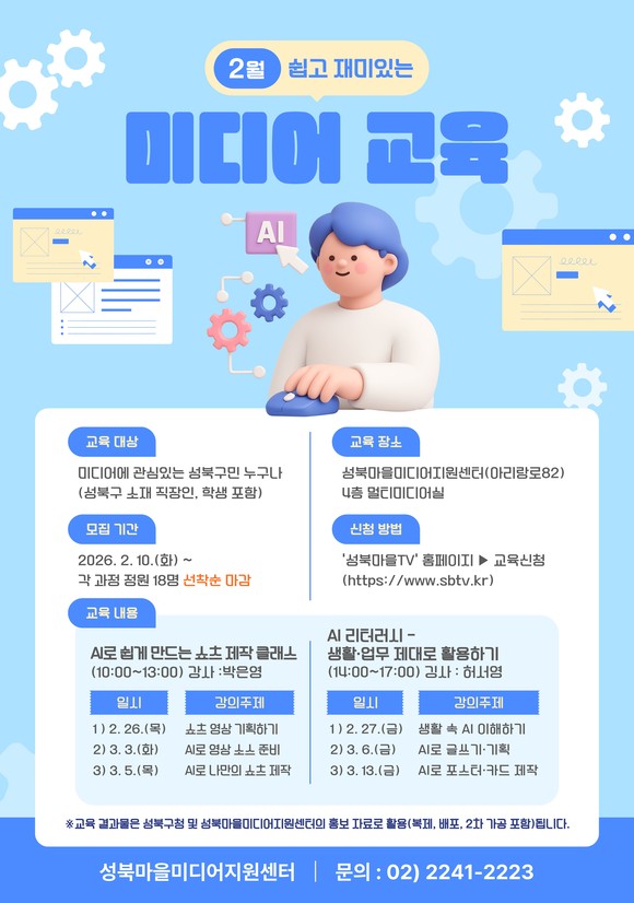 서울 성북구 성북마을미디어지원센터가 2월 10일부터 AI 활용 미디어 교육 수강생을 선착순으로 모집한다.