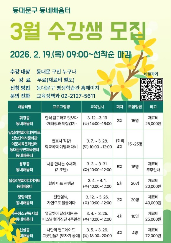 참여 대상은 동대문구 주민 누구나이며, 수강 신청은 동대문구 평생학습관 누리집에서 온라인 선착순으로 받는다. 3월 프로그램의 경우 접수 기간이 2월 19일부터 3월 1일까지로 안내돼 있으며, 동네배움터 강좌 목록에는 총 58건의 프로그램이 게시돼 있다.