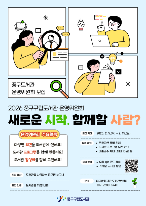 도서관 운영에 관심 있는 주민이라면 누구나 운영위원으로 참여할 수 있다. 모집기간은 오는 15일까지로, 포스터 내 그림무늬(QR코드)를 통해 온라인으로 또는 가까운 중구 구립도서관에 방문해 신청하면 된다.