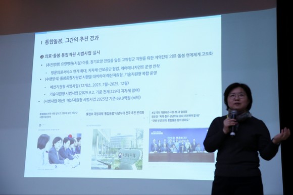 강연은 국민건강보험공단 통합돌봄정책개발센터 유애정 센터장이 맡아, 통합돌봄 정책의 추진 배경과 지역사회의 역할, 민·관 협력의 중요성을 실제 사례를 중심으로 설명해 참석자들의 이해를 도왔다. 이어진 질의응답 시간에는 현장의 다양한 경험과 고민이 공유되며 실질적인 소통의 장이 마련됐다.
