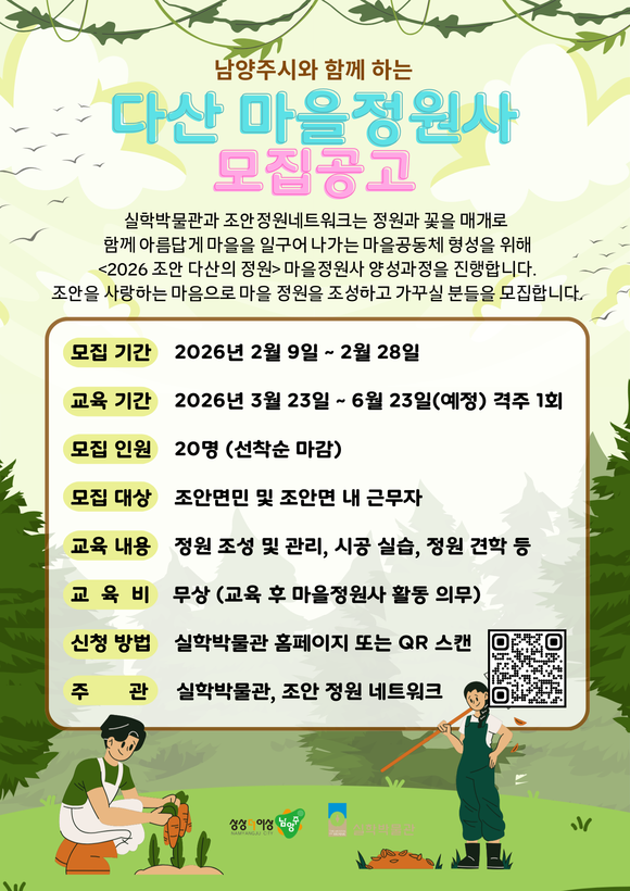 교육을 진행하는 조안정원네트워크 배호영 대표는 서울시 조경과장으로 서울숲과 월드컵공원 조성을 이끈 전문가다. 은퇴 후에는 남양주시 조안면에서 이로가든스쿨을 운영하며 정원문화 확산을 위한 활동을 이어오고 있다. 배 대표는 “실학박물관의 지역 연계가 단순한 의견 수렴에 머물지 않고, 마을정원사 양성과 커뮤니티 정원 조성이라는 실제 사업으로 이어져 매우 뜻깊다”며 “정원과 꽃을 매개로 이웃과 함께 아름다운 마을을 일구어 갈 분들의 참여를 환영한다”고 말했다.