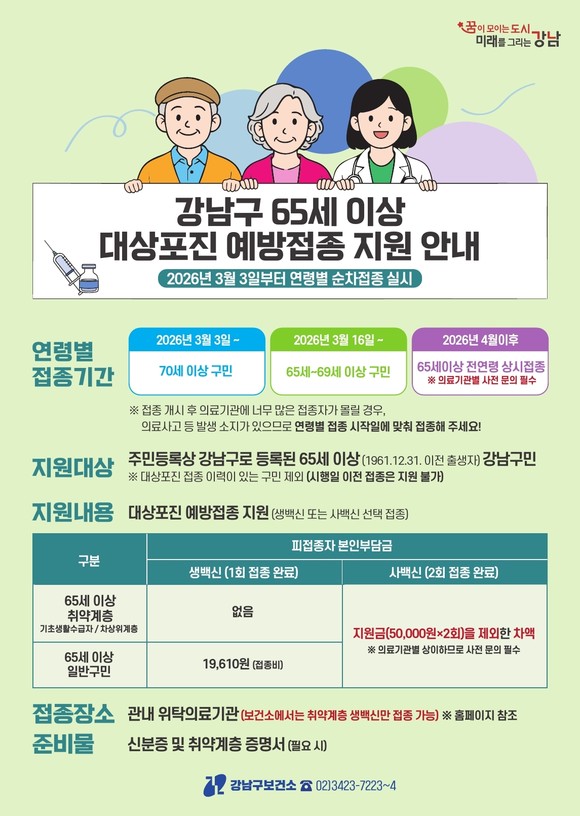 서울 강남구(구청장 조성명)가 65세 이상 강남구민을 대상으로 대상포진 예방접종 지원을 확대한다. 기존 기초생활수급자 중심의 지원을 65세 이상 전체 구민으로 넓히고, 3월 3일부터 연령별 순차 접종을 시행한다.