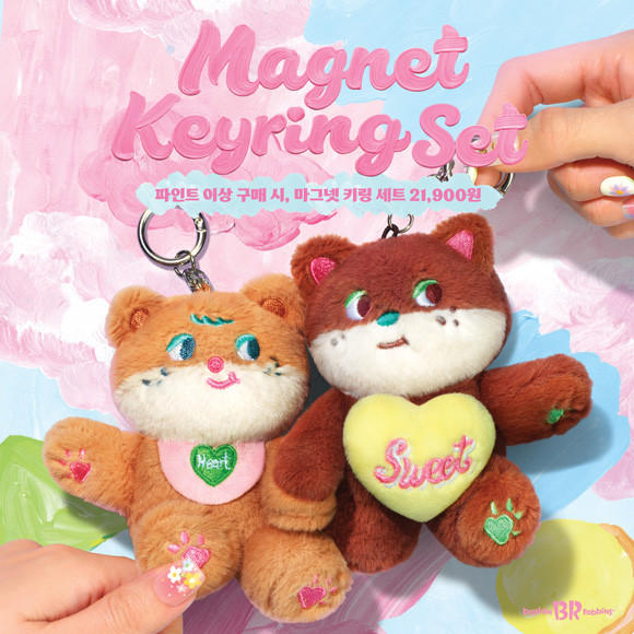 키링은 이슬로 작가 캐릭터로 카멜 컬러와 브라운 컬러가 한 세트로 구성됐다. 각 캐릭터 손 부분에 마그넷이 내장돼 두 키링을 가까이 두면 서로 손을 맞잡는 듯한 연출이 가능하다.