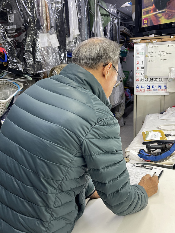 양천구 공중위생업소(세탁업) 영업주가 수기점검표를 작성하고 있는 모습. 사진=양천구청