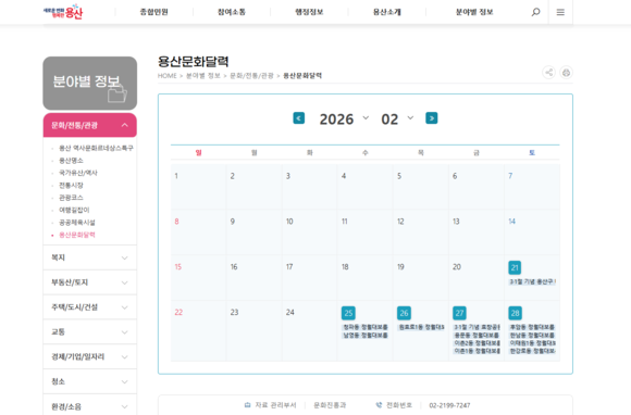 공연·전시·체험 등 문화행사 정보 ‘달력형’ 통합 제공... 용산구청 누리집에서 날짜별 일정 및 상세정보 확인