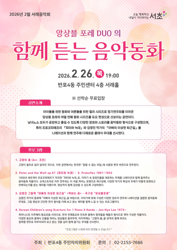반포4동 주민자치위원회(위원장 장영화)가 주최하는 이번 행사는 피아노 듀오 ’앙상블 포레 DUO‘가 선보이는 음악동화 콘서트로 지역 주민들에게 다채로운 음악적 경험을 제공하고자 마련됐다. 아이들을 위한 동화 형식과 어른들을 위한 클래식 감성을 함께 담아 남녀노소 모두가 공감하고 즐길 수 있는 무대가 꾸며질 것으로 기대된다.