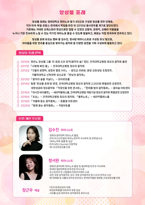 앙상블 포레는 경희대학교 피아노과 동문 4인으로 구성된 피아노 앙상블 단체로, 2010년 창단 이후 교향곡, 관현악, 오페라 작품 등을 피아노 앙상블로 재해석하며 활발한 연주활동을 이어오고 있다. 이번 공연에는 멤버 김수진, 정서완 피아니스트가 듀오 편성으로 무대에 오른다. 공연 시간은 약 1시간이며, 선착순 무료 입장으로 누구나 공연을 자유롭게 관람할 수 있다. 기타 자세한 사항은 반포4동주민센터로 문의하면 된다.