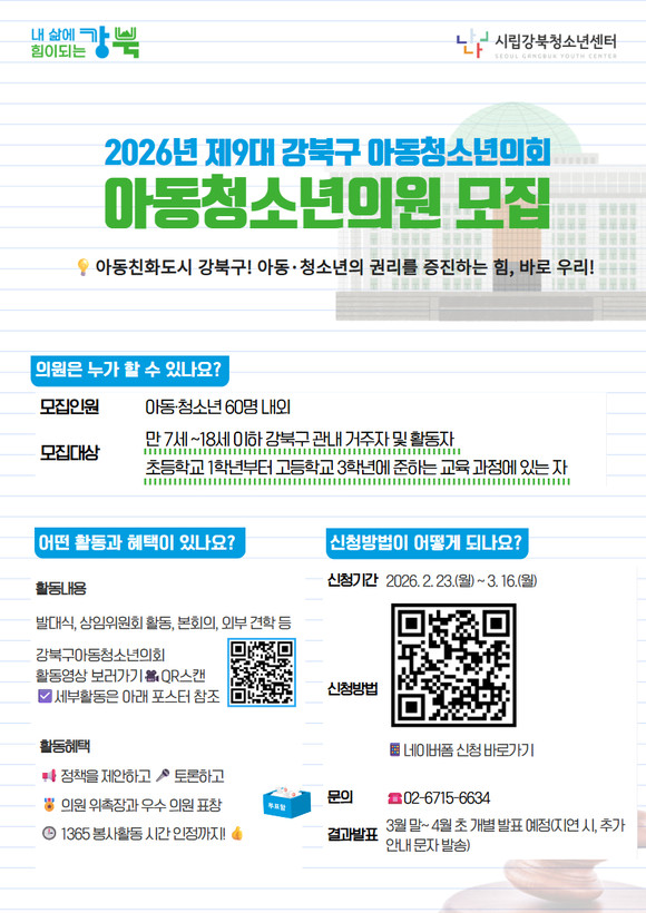 모집 인원은 60명 내외로, 모집 대상은 강북구에 거주하거나 관내 학교 및 시설에서 활동 중인 만 7세부터 18세 이하의 아동·청소년이다. 참여를 희망하는 아동·청소년은 오는 3월 16일까지 포스터 내 QR코드를 통해 신청하면 된다.