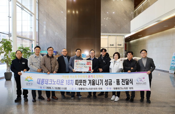 1월 13일 대륭테크노타운 18차 운영위원회는 백미(20kg) 8포, 백미(10kg) 300포, 현금 463만 원 등 총 1,615만 원 상당의 성품과 성금을 기부했다. 방영찬 회장은 “작은 정성이지만 어려운 이웃들에게 따뜻한 위로가 되길 바라는 마음으로 준비했다”라며, “지역사회가 서로 힘이 되는 공동체가 될 수 있도록 꾸준히 나눔을 실천하겠다”라고 전했다.