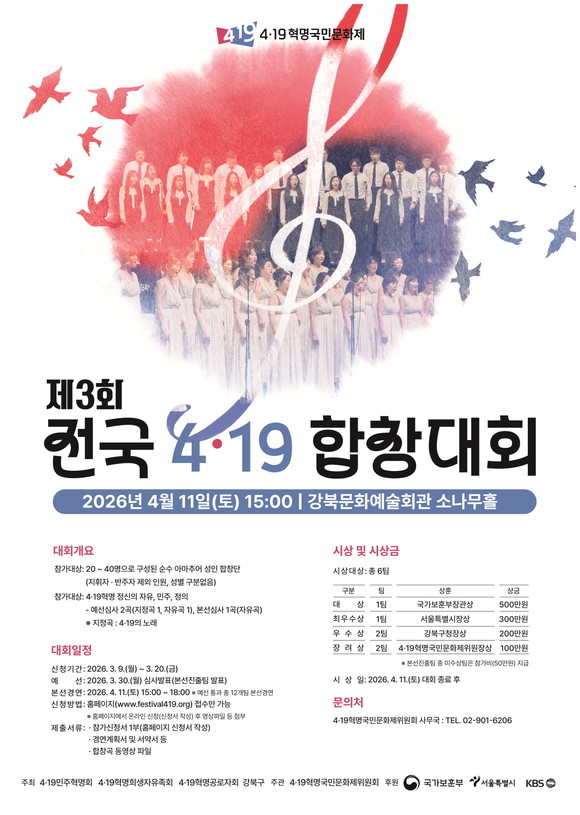 참가를 희망하는 합창단은 오는 3월 9일부터 3월 20일까지 4·19혁명국민문화제 공식 홈페이지(festival419.org)를 통해 신청할 수 있다. 참가팀은 지정곡 ‘4·19의 노래’와 자유곡 1곡을 담은 합창 영상을 제출해야 한다.