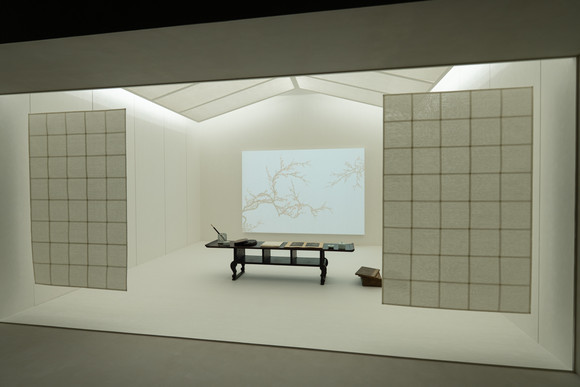 두 번째 특징은 서화의 미감을 재해석하는 공간이라는 점이다. 전시실에 가면 타이틀 벽을 보고 작은 회랑을 지나게 된다. 한지의 질감과 손목의 농담이 차분하게 다가오는 단정한 공간이 펼쳐진다. 짙은 먹기가 한 지의 색을 기본 톤으로 하여 수목이 물들듯 스며드는 분위기를 구현하고자 했다. 또한 머무르고 사유화하는 사회의 경험을 더욱더 높이고자 했다.
