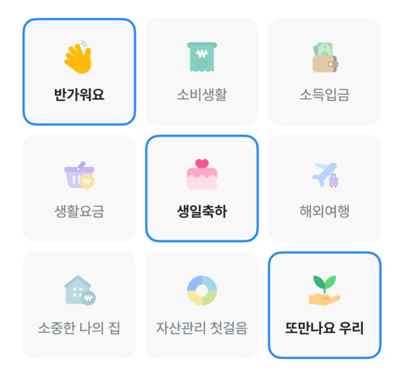 빙고판은 △반가워요 △소비생활 △소득입금 △생활요금 △생일축하 △해외여행 △소중한 나의 집 △자산관리 첫걸음 △또만나요 우리 등 총 9개 칸으로 구성됐다. 생활비 입금, 환전, 생일 축하 보너스 등 일상적인 금융거래를 통해 빙고를 완성하면 줄 수에 따라 우대금리가 차등 적용된다.