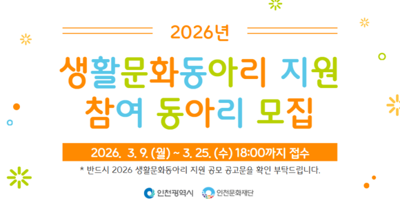인천광역시(시장 유정복)와 인천문화재단(대표이사 이종관)은 인천 시민들의 자발적인 문화예술 활동을 지원하기 위해 「2026 생활문화동아리 지원」 사업을 추진한다.