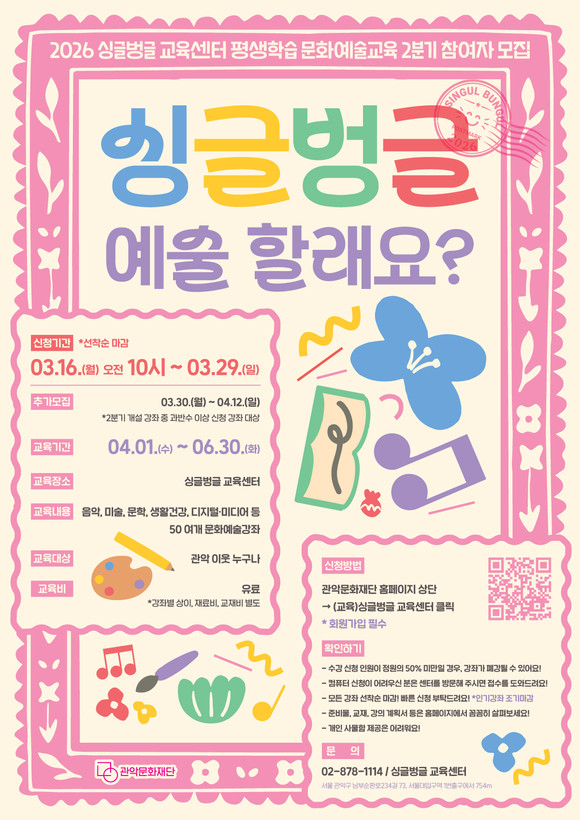 관악문화재단(대표이사 소홍삼) 싱글벙글교육센터가 오는 16일(월)부터 3월 29일(일)까지 ‘2026년 2분기 평생학습 문화예술교육 프로그램’ 수강생을 모집한다.
