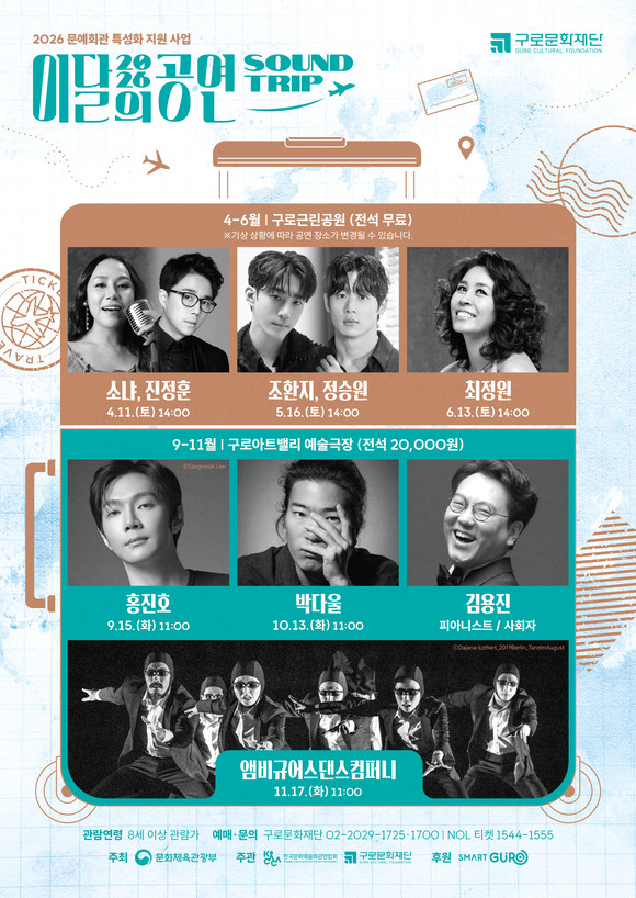 2026 이달의 공연 〈사운드트립〉은 관객들이 일상 속에서 부담 없이 문화예술을 즐길 수 있도록 상반기 공연은 누구나 관람할 수 있는 열린 공연으로 진행되며, 하반기 공연은 전석 2만원(구로구민 30% 할인 등)으로 운영된다.
