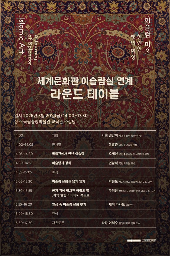 국립중앙박물관(관장 유홍준)은 2026년 3월 20일(금) 오후 2시 교육관 소강당에서 세계문화관 이슬람실 전시 연계 라운드테이블을 개최한다. 이번 행사는 지난 해 새롭게 문을 연 상설전시관 3층 세계문화관 이슬람실 전시와 연계하여 이슬람 세계를 다채로운 시각에서 이해하고 대중과 공유하는 자리로 마련하였다.