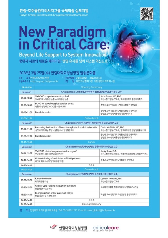 이번 심포지엄에서는 중환자 치료 연구기관인 호주중환자리서치그룹 석학들이 방한해 한림대성심병원 의료진과 함께 중환자 치료에 대한 발표를 진행한다.