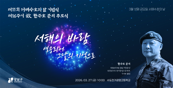 서울 강남구(구청장 조성명)가 3월 27일 수도전기공업고등학교에서 ‘제11회 서해수호의 날 기념식’과 ‘제16주기 故 한주호 준위 추모식’을 연다. 주민, 학생, 보훈단체, 군 관계자 등 500여 명이 함께할 예정이다.